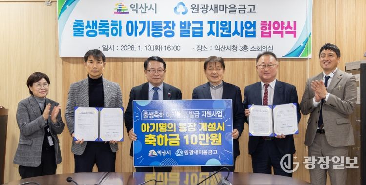 익산시는 13일 시청 소회의실에서 원광새마을금고와 '출생축하 아기통장 발급 지원사업'을 위한 업무협약을 체결했다.