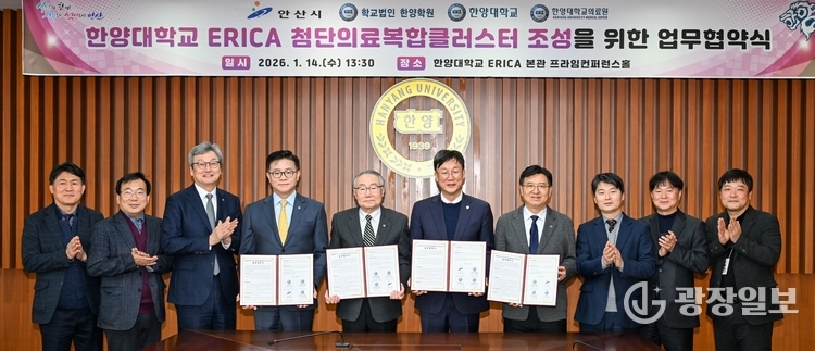 안산시는 14일 한양대학교 ERICA 프라임컨퍼런스홀에서 학교법인 한양학원, 한양대학교 ERICA, 한양대의료원과 함께 ‘한양대학교 ERICA 첨단의료복합클러스터 조성을 위한 업무협약’을 체결했다.