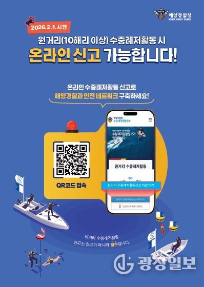 광장일보 주재영 기자 | 중부지방해양경찰청은 원거리 수중레저 활동자의 안전관리를 강화하고 현장 대응의 효율성을 높이기 위해 원거리 수중레저 활동 신고 방법을 개선한다고 밝혔다.