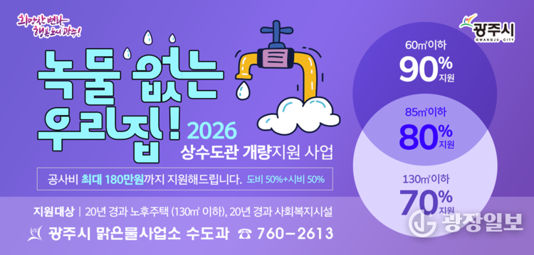 광주시= 주재영 기자 | 광주시는 깨끗하고 안전한 수돗물 공급을 위해 ‘녹물 없는 우리 집 수도관 개량 지원사업’을 추진한다고 23일 밝혔다.