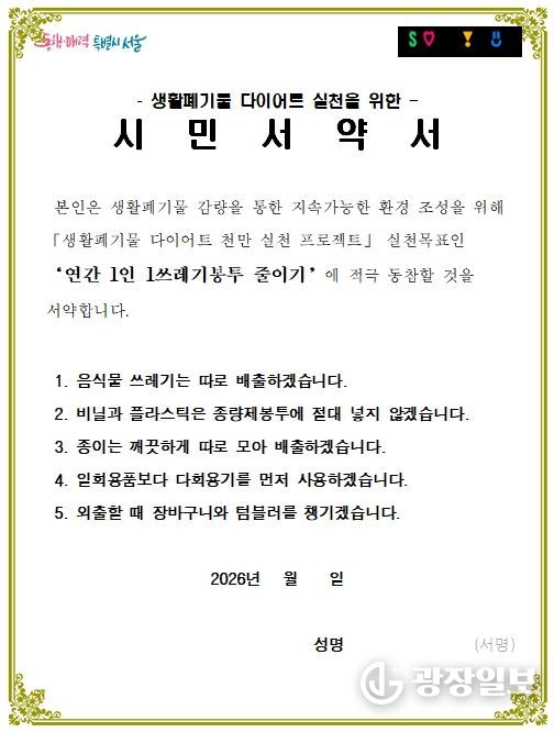 시민 실천서약은 음식물쓰레기 분리배출, 비닐·플라스틱 종량제봉투 혼입 금지, 종이류 분리배출, 다회용기 우선 사용, 장바구니·텀블러 지참 등 실생활에서 참여할 수 있는 항목으로 구성될 예정이다.