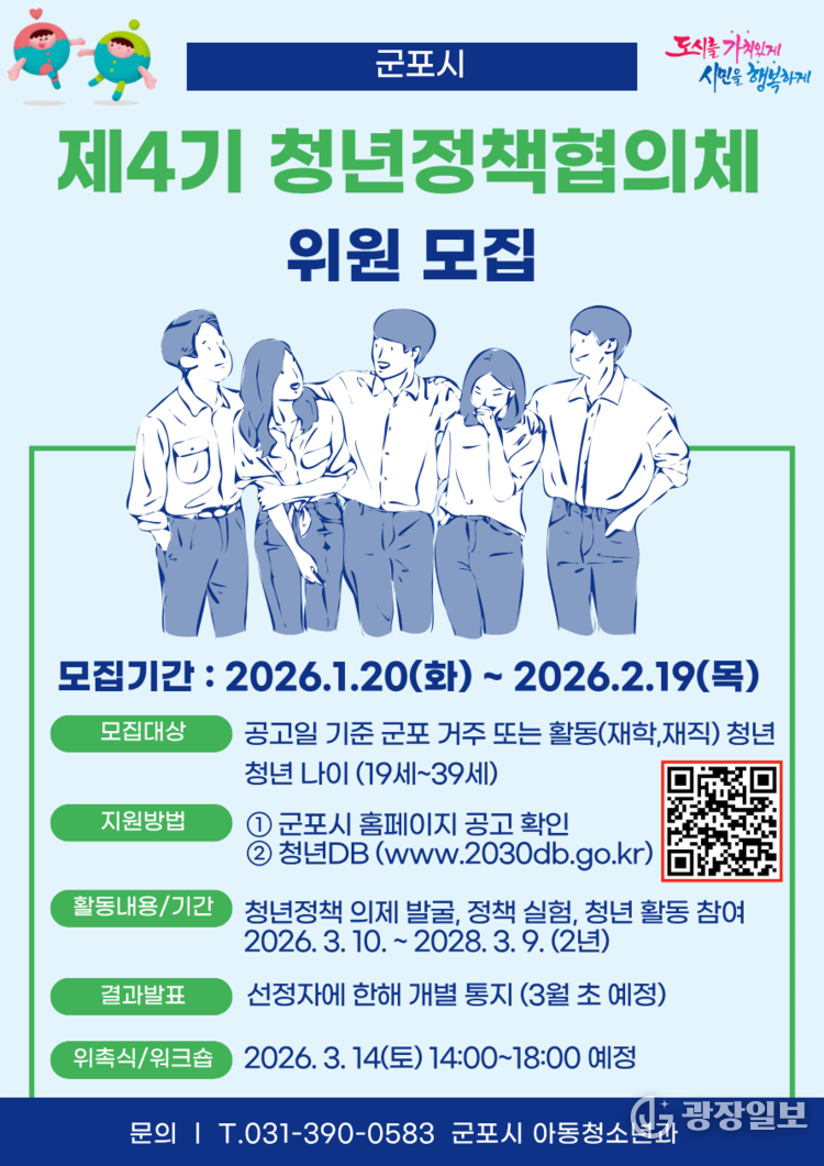 군포시=주재영 기자 | 군포시는 오는 2월 19일(목)까지 제4기 군포시 청년정책협의체 위원을 모집한다고 밝혔다.