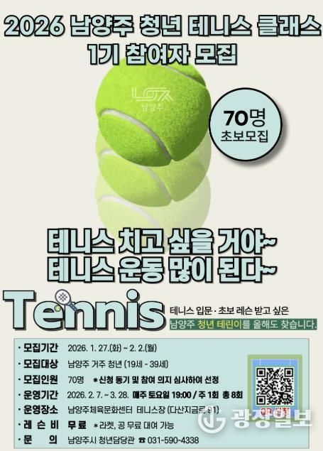 광장일보 주재영 기자 | 남양주시는 27일부터 내달 2일까지 ‘2026 남양주 청년 테니스 클래스 1기’ 참여자를 모집한다고 밝혔다.