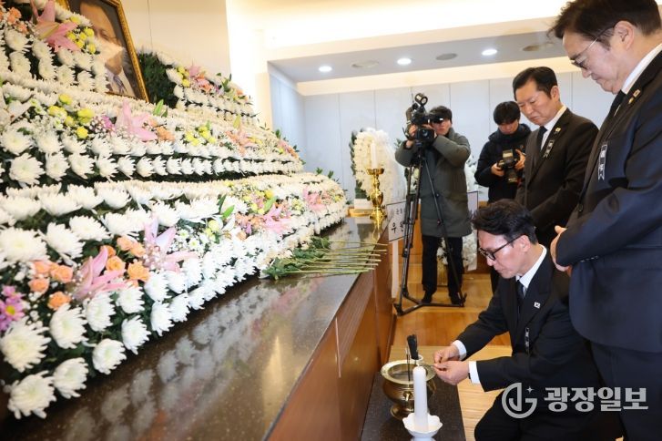 광장일보 주재영 기자 | 김민석 국무총리가 27일 종로구 서울대학교병원 장례식장에서 故 이해찬 민주평통 수석부의장의 빈소를 조문하고 있다.