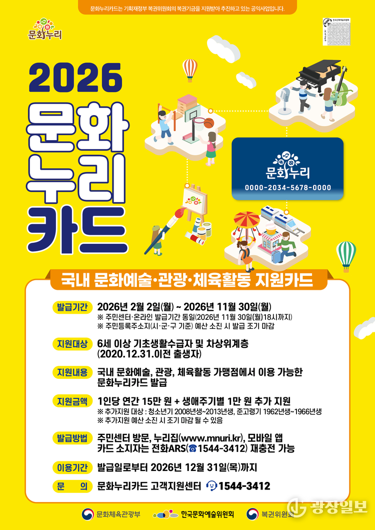 광명시= 주재영 기자 | 광명시는 경제적 여건으로 문화생활이 어려운 저소득층을 대상으로 통합문화이용권(문화누리카드) 지원을 확대한다고 28일 밝혔다. 지원 대상은 6세 이상 기초생활수급자와 차상위계층으로, 올해 지원금은 지난해보다 1만 원 인상된 15만 원이다.