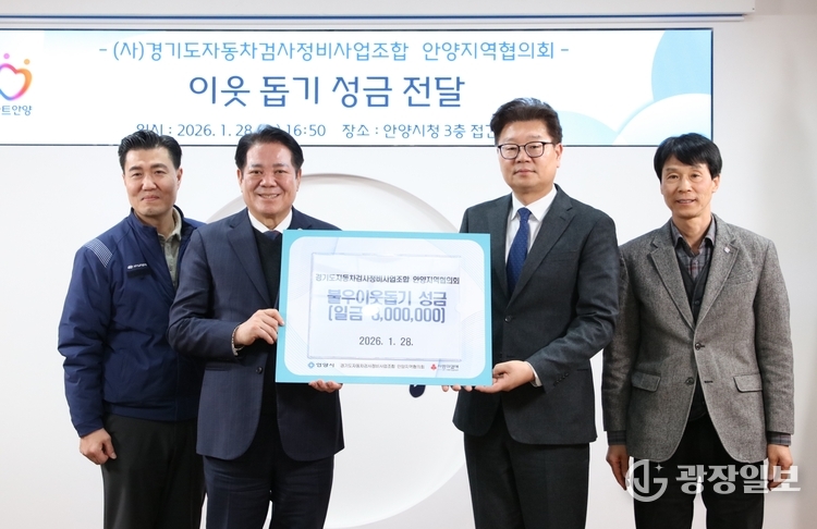 안양시= 주재영 기자 | 안양시(시장 최대호)는 29일 (사)경기도자동차검사정비사업조합 안양지역협의회(회장 박현준)가 설 명절을 앞두고 지역 내 어려운 이웃을 위해 성금 300만원을 기탁했다고 밝혔다.