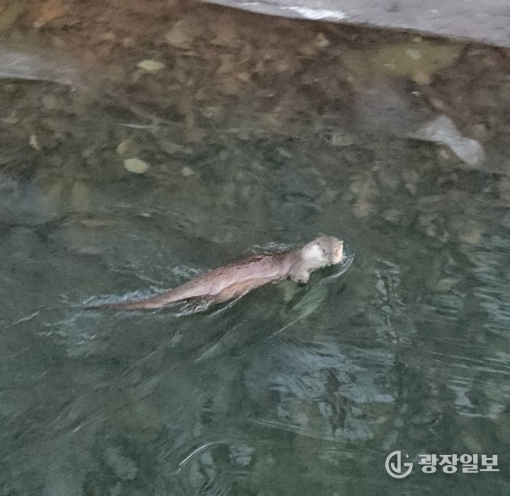 군포시= 주재영 기자 | 군포시의 대표적인 도심 휴식처인 반월호수에서 멸종위기 야생생물 1급이자 천연기념물인 수달이 모습을 드러냈다. 지속적인 수질 개선 정책이 생태계 복원으로 이어지고 있다는 점에서 의미 있는 성과로 평가된다.