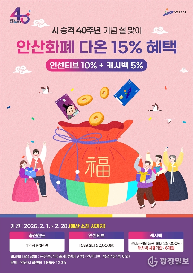 안산시=주재영 기자 | 안산시(시장 이민근)는 시 승격 40주년과 설 명절을 맞아 시민들의 소비 부담 완화를 위해 지역화폐 ‘다온’의 혜택을 한시적으로 확대한다.