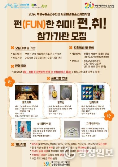 광장일보 주재영 기자 | 부평구청소년수련관은 2026년 사회배려청소년지원사업 ‘펀(fun)한 취미, 펀.취!’에 참여할 기관을 모집한다고 밝혔다.