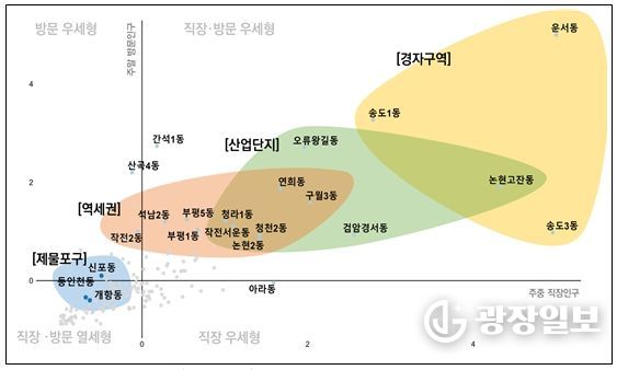 직장·방문인구 모두 많은 지역은 송도(4개 동), 영종(운서동), 청라(3개 동)와 부평(6개 동), 구월(5개 동), 주안(2개 동)으로 나타났는데, 공통적으로 교통접근성이 우수하고, 상업·업무·산업기능이 집적된 지역에 집중되는 경향을 보인다.