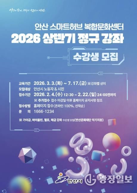 광장일보 주재영 기자 | 안산시 스마트허브복합문화센터는 오는 4일부터 상반기 정규강좌 수강생을 모집한다고 3일 밝혔다.
