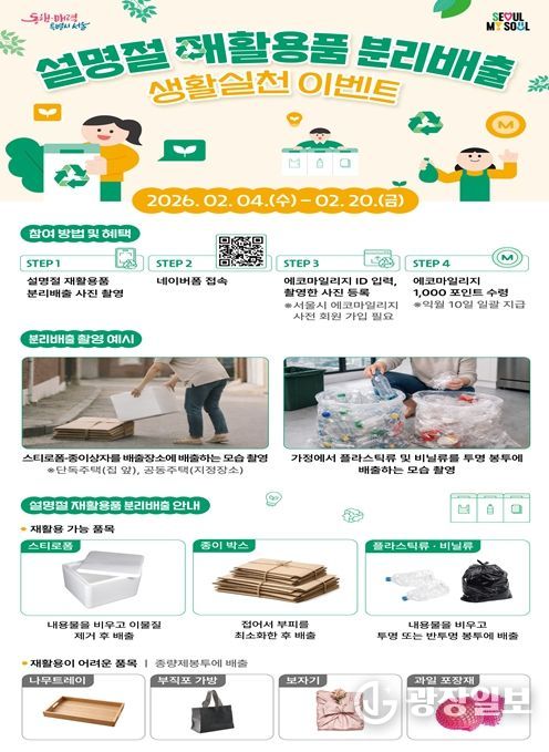 광장일보 주리아 기자 | 서울시는 설 명절을 맞아 명절 기간 중 급증하는 쓰레기를 줄이기 위해 재활용품 분리배출 캠페인과 설 선물 과대포장 집중단속을 함께 추진한다. 시민 참여형 이벤트와 유통업체 대상 점검을 동시에 진행해, 명절 쓰레기 감축과 자원순환 문화 확산을 도모한다는 계획이다.