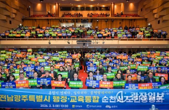 광장일보 주재영 기자 | 순천시는 전라남도와 함께 3일 순천문화예술회관에서 전남광주특별시 행정·교육 통합 도민 공청회를 개최하고, 통합 추진의 방향과 핵심 과제를 시민과 함께 논의했다.