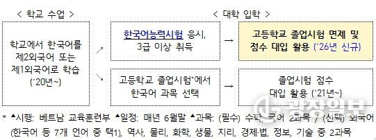 베트남 대입제도는 우리나라의 대학수학능력시험에 해당하는 전국 단위 시험인 ‘고등학교 졸업시험’을 중심으로 운영된다. 베트남 학생들은 졸업시험 과목 중 수학과 국어(베트남어)는 필수로 응시하고, 외국어·역사 등 9개 과목 중 2개를 선택해 총 4개 과목에 응시한다. 이번 결정은 한국어능력시험 성적으로 졸업시험 외국어 과목을 대체할 수 있다는 내용이다. 즉, 한국어능력시험에서 토픽(TOPIK) 3급 이상 취득한 학생은 졸업시험 선택과목 1개를 면제받고 환산된 한국어능력시험 점수를 졸업시험 성적으로 인정받을 수 있다.
