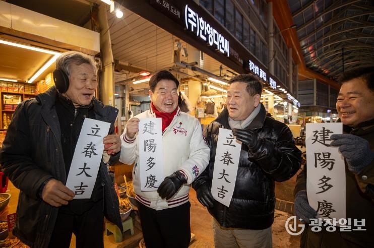 특히 이번 일정은 4일 ‘입춘’을 앞두고 진행돼 분위기가 남달랐다. 입춘은 24절기 가운데 첫 절기로 ‘봄의 시작’을 알리는 날로, 예로부터 대문에 ‘입춘첩’을 붙이며 한 해의 복을 기원해 왔다. 이 구청장과 상인들은 ‘입춘대길 건양다경(立春大吉 建陽多慶)’이라 적힌 종이를 함께 들어 보이며 환하게 웃는 사진을 남기기도 했다. 이 문구는 입춘에 많이 쓰이는 글귀로 “봄이 드니 크게 길하고, 좋은 경사가 많기를 바란다”는 뜻을 담는다. 구는 “설을 앞둔 시장의 분주함과 입춘이 상징하는 새출발의 기운이 맞물려, 주민과 상인 모두에게 작은 희망이 되길 바라는 마음”이라고 전했다.