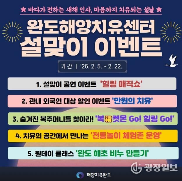 광장일보 주재영 기자 | 완도군은 설 명절을 맞아 귀성객, 군민, 관광객이 그동안 쌓인 피로를 풀고 활력을 얻을 수 있도록 ‘완도해양치유센터, 설맞이 힐링 이벤트’를 2월 5일부터 22일까지 운영한다.