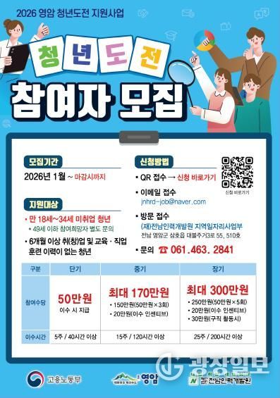 광장일보 주재영 기자 | 영암군이 (재)전남인력개발원과 ‘2026년 영암군 청년 도전 지원사업’ 참여자를 모집 중이다.