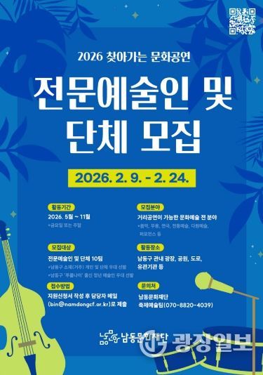 광장일보 주재영 기자 | 인천시 남동구 남동문화재단은 지역 곳곳을 무대로 펼쳐지는 ‘2026 찾아가는 문화공연’에 참여할 공연 전문예술인 및 단체를 오는 9~24일까지 공개 모집한다고 5일 밝혔다.