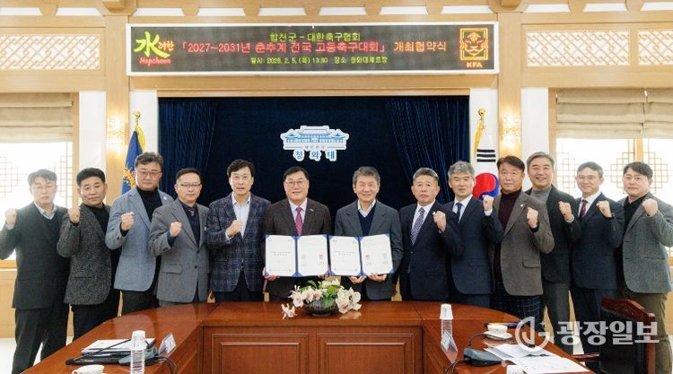 광장일보 주재영 기자 | 합천군은 5일 합천영상테마파크 청와대 세트장에서2027~2031년 춘·추계 전국 고등축구대회 개최 협약식을 가졌다고 밝혔다.