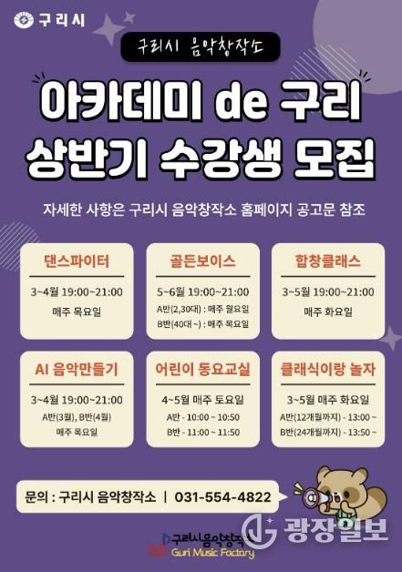 광장일보 주재영 기자 | 구리시는 잠재적 예술인 양성을 위해 구리시 음악창작소에서 운영하는 '2026 상반기 아카데미 de’구리'의 수강생을 2월 2일부터 모집하고 있다고 밝혔다.