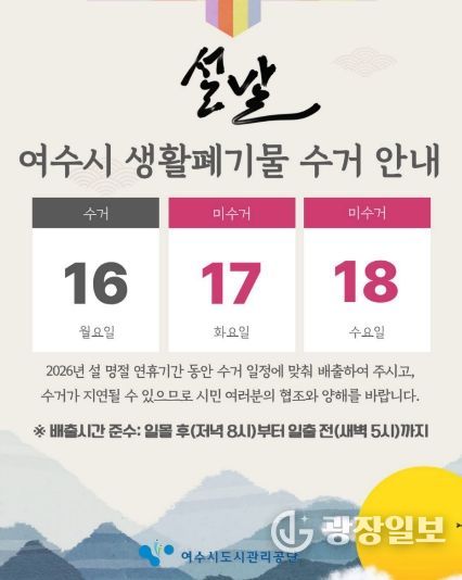 광장일보 주재영 기자 | 여수시도시관리공단(이사장 송병구)은 2026년 설 명절을 앞두고 귀성객과 관광객이 증가할 것으로 예상됨에 따라, 쾌적하고 깨끗한 도시환경 조성을 위해 여수시 전역을 대상으로 '설 명절 대비 청소종합 대책'을 시행한다고 6일 밝혔다.
