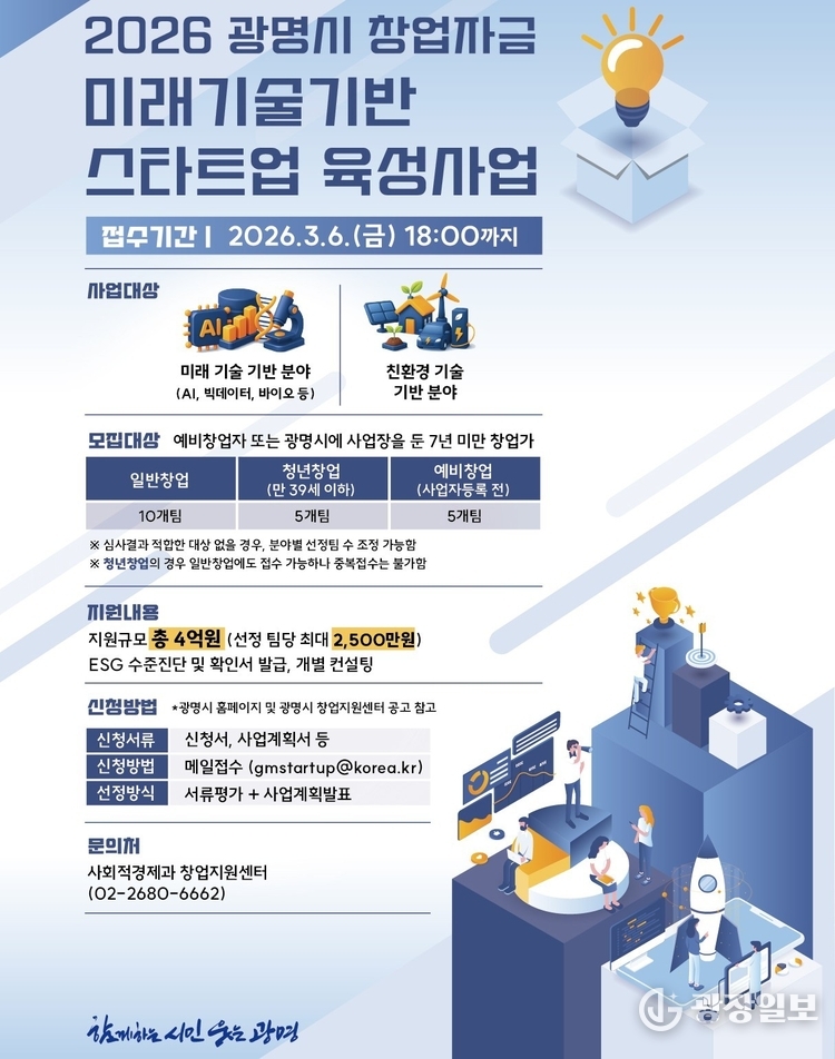 광명시= 주재영 기자 | 광명시(시장 박승원)는 미래 산업 경쟁력을 갖춘 창업기업을 육성하기 위해 ‘2026년 미래기술 스타트업 육성사업’ 참여자를 오는 3월 6일까지 모집한다.
