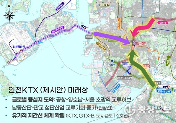 간선의 중심 직결화는 인천발 KTX, 인강선을 인천시청 권역에 직결하고, GTX-B, 경인선 지하화, 제2공항철도와 연계해 도심부를 광역교통망의 핵심 허브로 설정하는 전략이다.