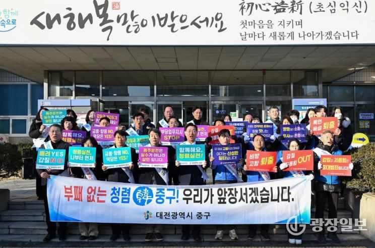 광장일보 나학천 기자 | 대전 중구는 설 명절을 앞둔 9일 아침 출근길 구청사 현관 및 각 부서를 방문하여 음주운전 근절 및 청렴 문화 확산을 위한 청렴 캠페인을 전개했다고 밝혔다.