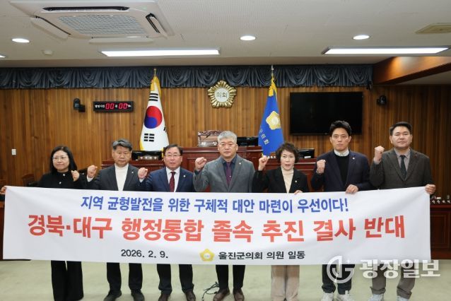 광장일보 주재영 기자 | 울진군의회는 2월 9일 본회의장에서 경북·대구 행정통합 졸속 추진에 대한 강력한 반대 입장을 담은 성명서를 발표했다.