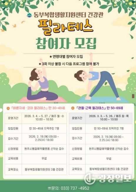 광장일보 이현나 기자 | 원주시 동부복합생활지원센터 건강관은 오는 19일부터 중·장년을 대상으로 한 필라테스 프로그램 참여자를 모집한다.