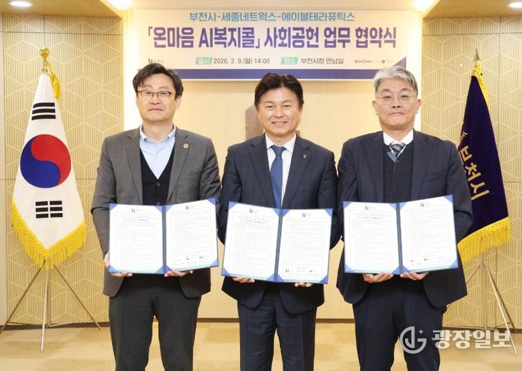 광장일보 주재영 기자 | 부천시는 지난 9일 시청 만남실에서 세종네트웍스와 에이블테라퓨틱스와 함께 ‘온마음 AI복지콜’ 사회공헌 업무 협약을 체결했다.