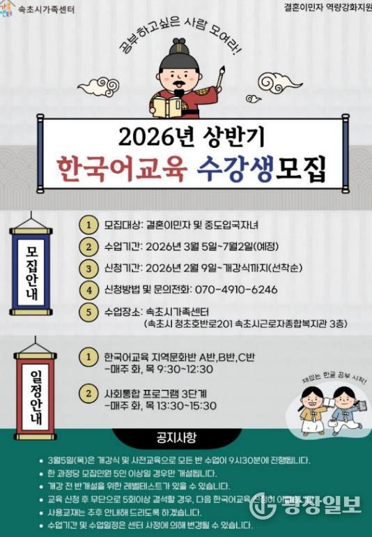 광장일보 이현나 기자 | 속초시가족센터가 속초시에 거주하는 결혼이민자의 지역사회 정착과 자립을 돕기 위해 상반기 한국어 교육과 운전면허 취득 지원사업 참여자를 모집한다.