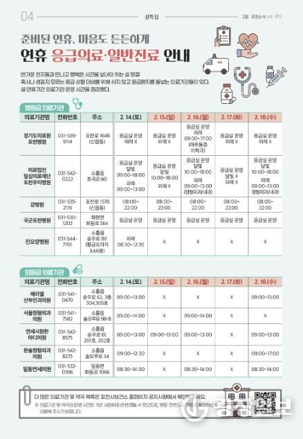 광장일보 이현나 기자 | 포천시는 오는 14일부터 18일까지 설 연휴 기간 동안 시민들이 안정적으로 의료서비스를 이용할 수 있도록 응급대응체계를 강화한다.