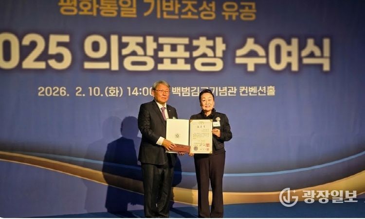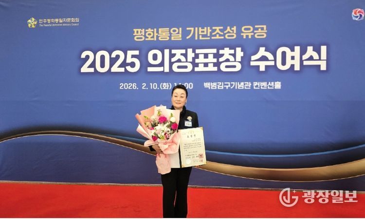 광장일보 주재영 기자 | 정임행 민주평화통일자문회의 강남구협의회 차석(㈜파모소 회장)이 2026년 2월 10일 오후 2시 서울 용산구 백범김구기념관 컨벤션홀에서 개최된 민주평화통일자문회의 2025 의장표창 수여식(서울지역)에서 민주평화통일자문회의 의장 대통령 표창을 수상했다.