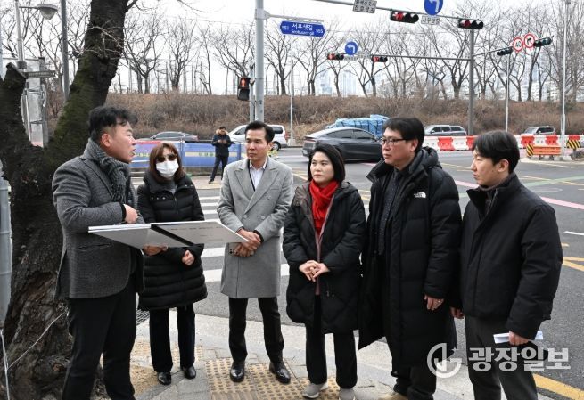 광장일보 주리아 기자 | 서울특별시의회 시민권익위원회 위원으로 활동하고 있는 박춘선 의원(강동3, 국민의힘)이 2월 10일 교통정체로 시민 불편이 지속되고 있는 가산한내보도육교 앞 교차로를 직접 찾아 현장 점검을 실시했다. 현장에는 서울특별시의회 현장민원과와 서부간선도로 주관 부서인 서울시 도로계획과, 도시기반시설본부 관계자가 함께 했다.
