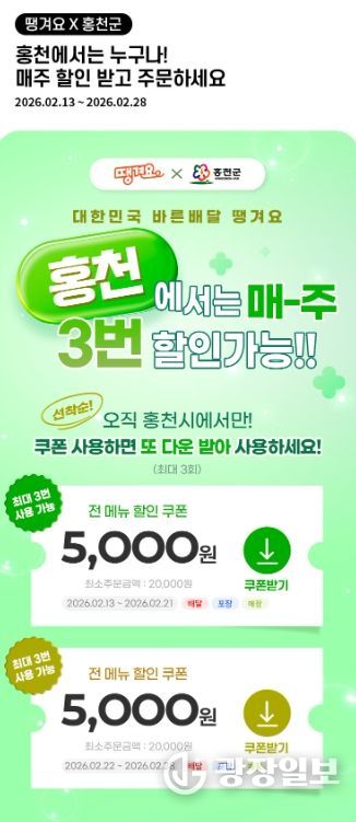 이번 이벤트는 신한은행 ‘땡겨요’ 사업단과의 공동 마케팅 협약을 바탕으로 추진됐으며, 공공배달앱 활성화를 통해 소상공인의 경영 부담을 완화하고 지역 경제의 활력을 회복하고자 마련된 홍천군 차원의 정책적 대응이다.