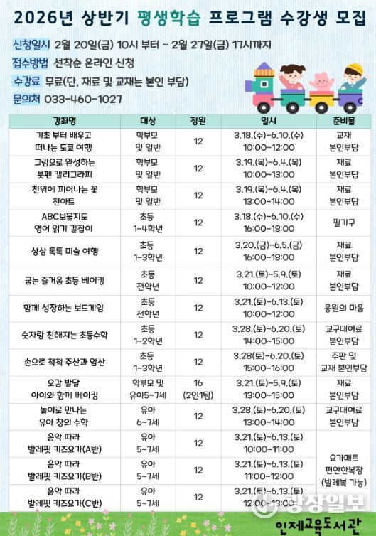 광장일보 이현나 기자 | 인제교육도서관은 3월부터 6월까지 지역주민의 지속적인 성장과 자아실현 지원을 위해 2026년 상반기 평생학습 프로그램을 운영한다.