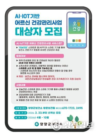 광장일보 이현나 기자 | 양양군은 스마트기기(AI.IoT) 기반 어르신 건강관리사업에 참여할 65세 이상 어르신 200명을 오는 2월 23일부터 선착순으로 모집한다.