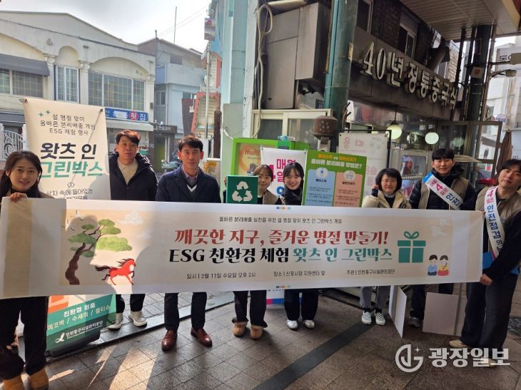 광장일보 주재영 기자 | 인천중구시설관리공단은 공단 임직원들이 설을 앞두고 지난 11일 신포국제시장에서 지역 주민들을 대상으로 생활 속 올바른 분리배출 실천을 유도하기 위한 체험형 친환경 행사 ‘왓츠 인 그린박스’를 진행했다고 밝혔다.