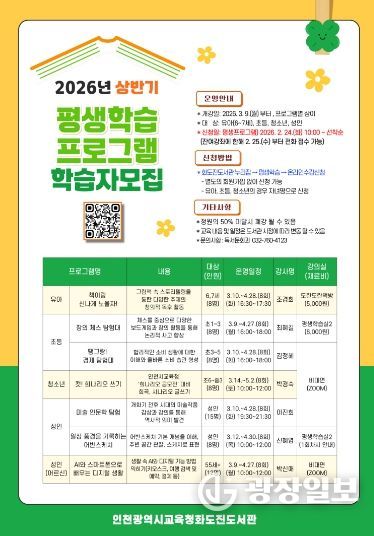 광장일보 주재영 기자 | 인천광역시교육청화도진도서관은 시민의 다양한 학습 수요를 충족하기 위하여, 오는 24일부터 ‘2026년 상반기 평생학습프로그램’학습자를 모집한다.