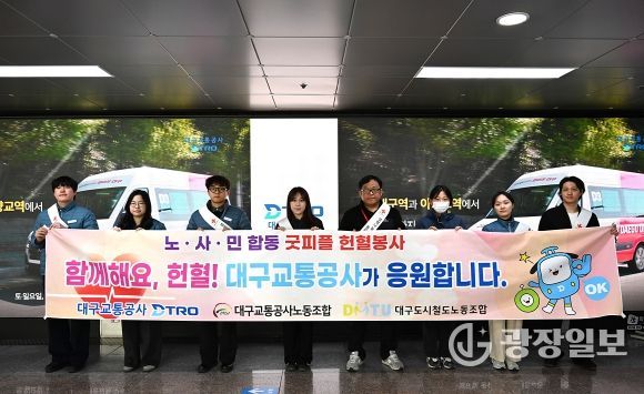 광장일보 주재영 기자 | 대구교통공사는 겨울철 혈액 보유량 감소로 인한 국가적 혈액 수급 위기 극복에 동참하기 위해 지난 2월 11일부터 12일까지 양일간 상인동 본사와 월배·문양·칠곡경전철 차량기지 등 총 4개 사업장에서 생명 나눔 헌혈행사와 헌혈 참여 캠페인을 진행했다.