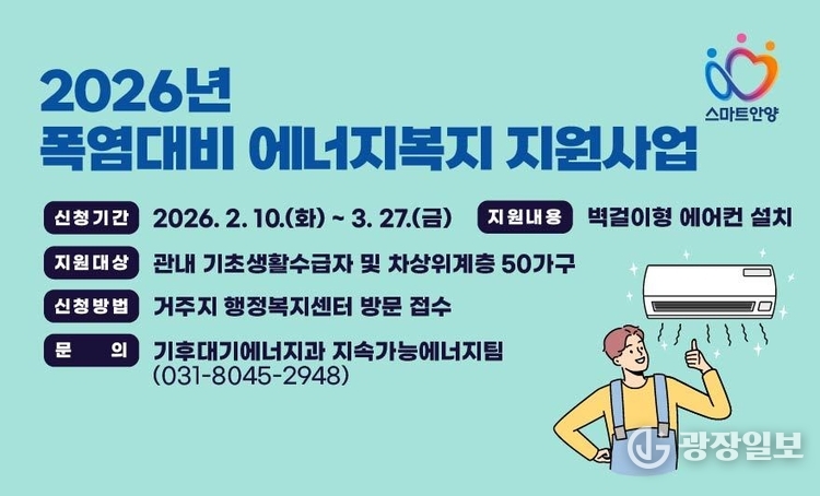 안양시= 주재영 기자 | 안양시는 다가오는 여름철 폭염에 대비해 저소득 취약계층을 대상으로 벽걸이형 에어컨을 설치해 주는 ‘2026년 폭염 대비 에너지복지 지원사업’을 추진한다고 18일 밝혔다.