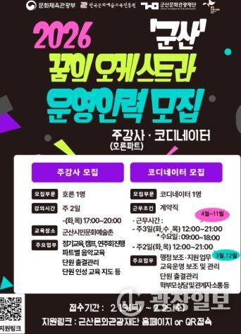 광장일보 주재영 기자 | (재)군산문화관광재단이 ‘2026 꿈의 오케스트라 군산’의 안정적인 운영과 교육 프로그램의 질적 향상을 위해 운영인력(주강사․코디네이터)을 25일까지 공개 모집한다.