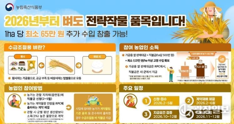 광장일보 주재영 기자 | 정읍시가 쌀 공급 과잉 해소와 농가 소득 안정이라는 두 마리 토끼를 잡기 위해 올해부터 ‘수급조절용 벼’를 전략작물직불제 대상 품목에 포함했다고 19일 밝혔다.