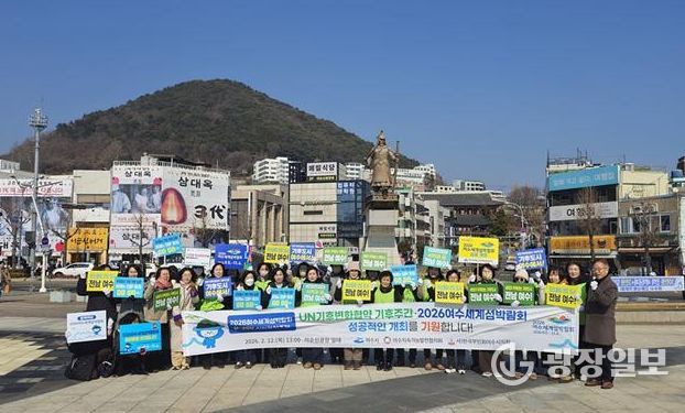 광장일보 주재영 기자 | 2026여수세계섬박람회 개막 D-200일을 앞두고 지난 12일 오후 1시에 이순신광장 일원에서 “기후위기 극복, 기후행동 시작” 가두행진 캠페인을 실시했다.