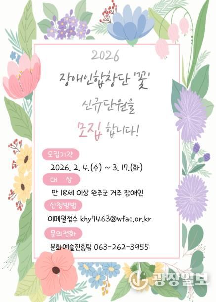 광장일보 주재영 기자 | 완주문화재단은 장애인의 문화예술 참여 확대와 지속 가능한 예술 활동 기반 조성을 위해 '2026 완주장애인합창단 ‘꽃’' 단원을 모집한다.