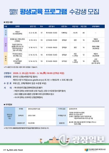광장일보 주재영 기자 | 경상북도교육청 예천도서관(관장 김미연)은 지역 주민의 평생학습 지원을 위해 2026년 상반기 평생교육 프로그램 수강생을 모집한다.