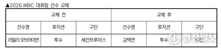광장일보 주재영 기자 | KBO 전력강화위원회는 부상으로 인해 WBC 참가가 어려워진 세인트루이스 라일리 오브라이언을 대체할 선수로 두산 김택연을 확정하고 WBC 조직위에 선수 교체 승인을 요청했다.