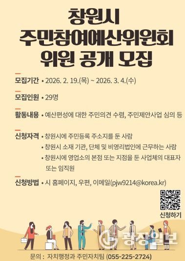 광장일보 주재영 기자 | 창원특례시는 올해 3월 말로 만료되는 주민참여예산위원 임기를 맞아 원활한 위원회 운영을 위해 2월 19일부터 3월 4일까지 신규 위원 29명을 모집한다.