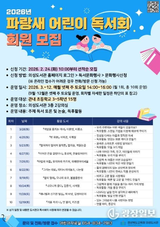광장일보 주재영 기자 | 경상북도교육청 의성도서관은 오는 24일부터 ‘2026년 파랑새 어린이 독서회’ 신규 회원을 모집한다.